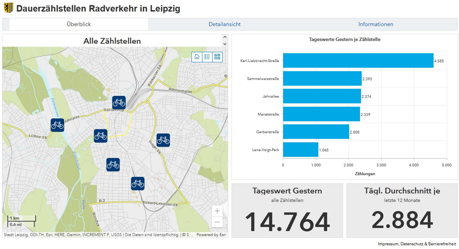Die Daten der Messstellen in der Gerberstraße, der Jahnallee, der Manetstraße, der Semmelweisstraße, der Karl-Liebknecht-Straße sowie im Lene-Voigt-Park helfen dem Verkehrs- und Tiefbauamt, den Radverkehr in Leipzig zu analysieren.Durch eine Kombination mit anderen Zahlen zum Radverkehr – etwa den Nutzerdaten der Stadtradel-App – lassen sich zudem präzise Prognosen zum Radverkehrsaufkommen im gesamten Stadtgebiet erstellen, betont das VTA aus Anlass der Veröffentlichung des neuen Dashboards zum Radverkehr, wo man die Zählergebnisse tagesaktuell einsehen kann.