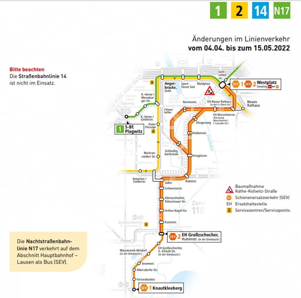 Durch die Käthe-Kollwitz-Straße kann in dieser Zeit keine Straßenbahn fahren. Hier verkehrt dafür ein Schienenersatzverkehr, der als SEV 2 bis Großzschocher fährt. Als SEV 1 übernimmt er auch die restliche Strecke bis Knautkleeberg.
