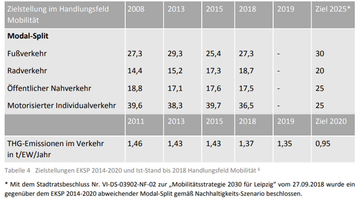 Die erreichten Zahlen und die vom Stadtrat beschlossenen Ziele im Modal Split der Verkehrsarten. Grafik: Stadt Leipzig, EKSP