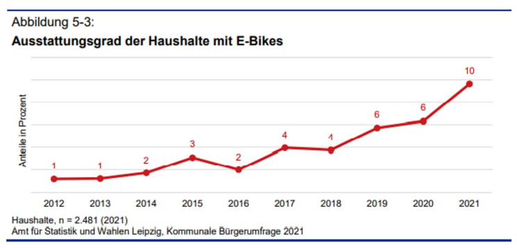 „Die Verbreitung der E-Bikes hat in den letzten Jahren in Leipzigs Haushalten deutlich zugenommen. Seit 2012 werden E-Bikes als Verkehrsmittel separat erfragt. Lag damals der Ausstattungsgrad noch bei circa 1 Prozent der Haushalte und somit im Bereich des geradeso statistisch messbaren, verfügt heute jeder zehnte Leipziger Haushalt über ein oder mehrere E-Bikes.