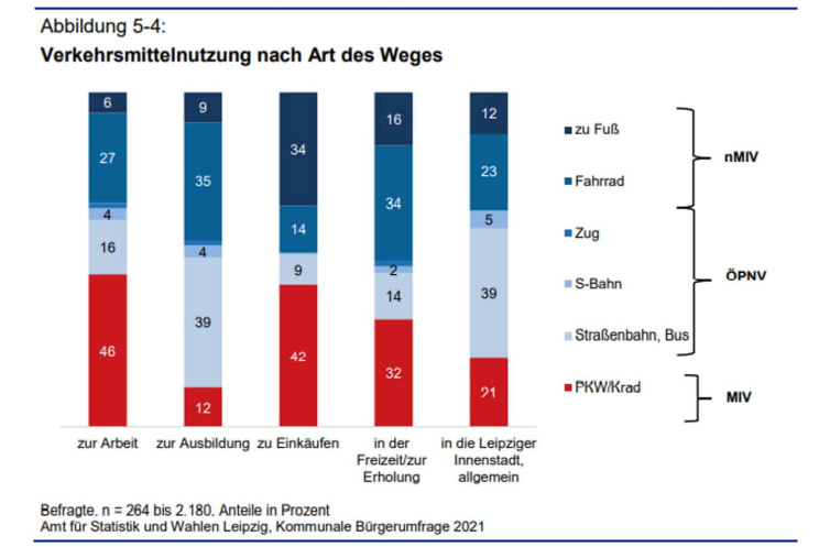 Auch wenn es im Bericht heißt: „Der motorisierte Individualverkehr (Pkw, Krad) stellt bei den Wegen zur Arbeit und zu Einkäufen aktuell den größten Anteil. Die in aller Regel nahezu täglichen Wege zur Arbeit werden von fast der Hälfte der erwerbstätigen Befragten mit dem Auto zurückgelegt. Auch (die regelmäßig stattfindenden) Einkäufe erledigen über 40 Prozent der Leipziger/-innen mit dem Auto.“