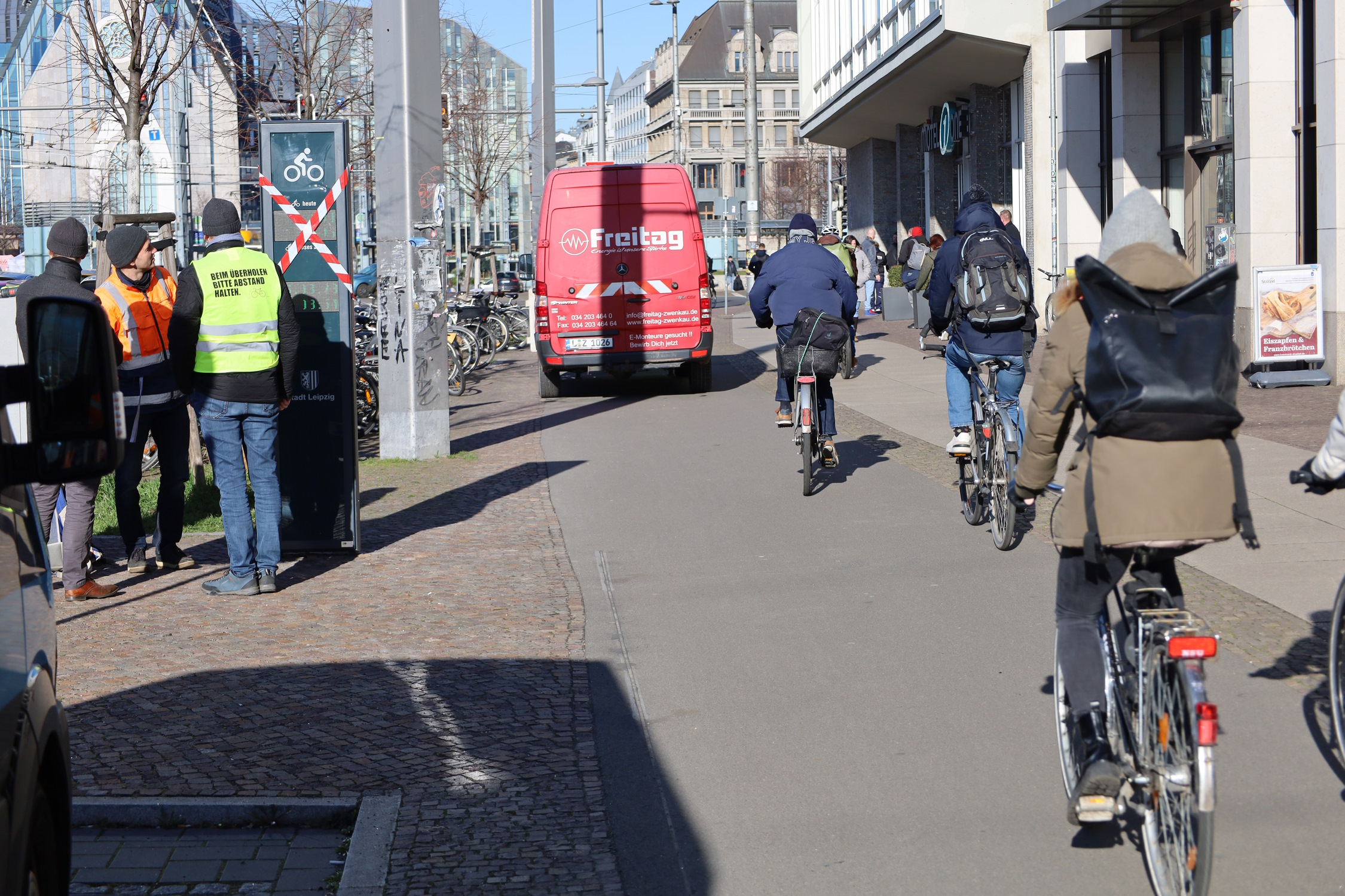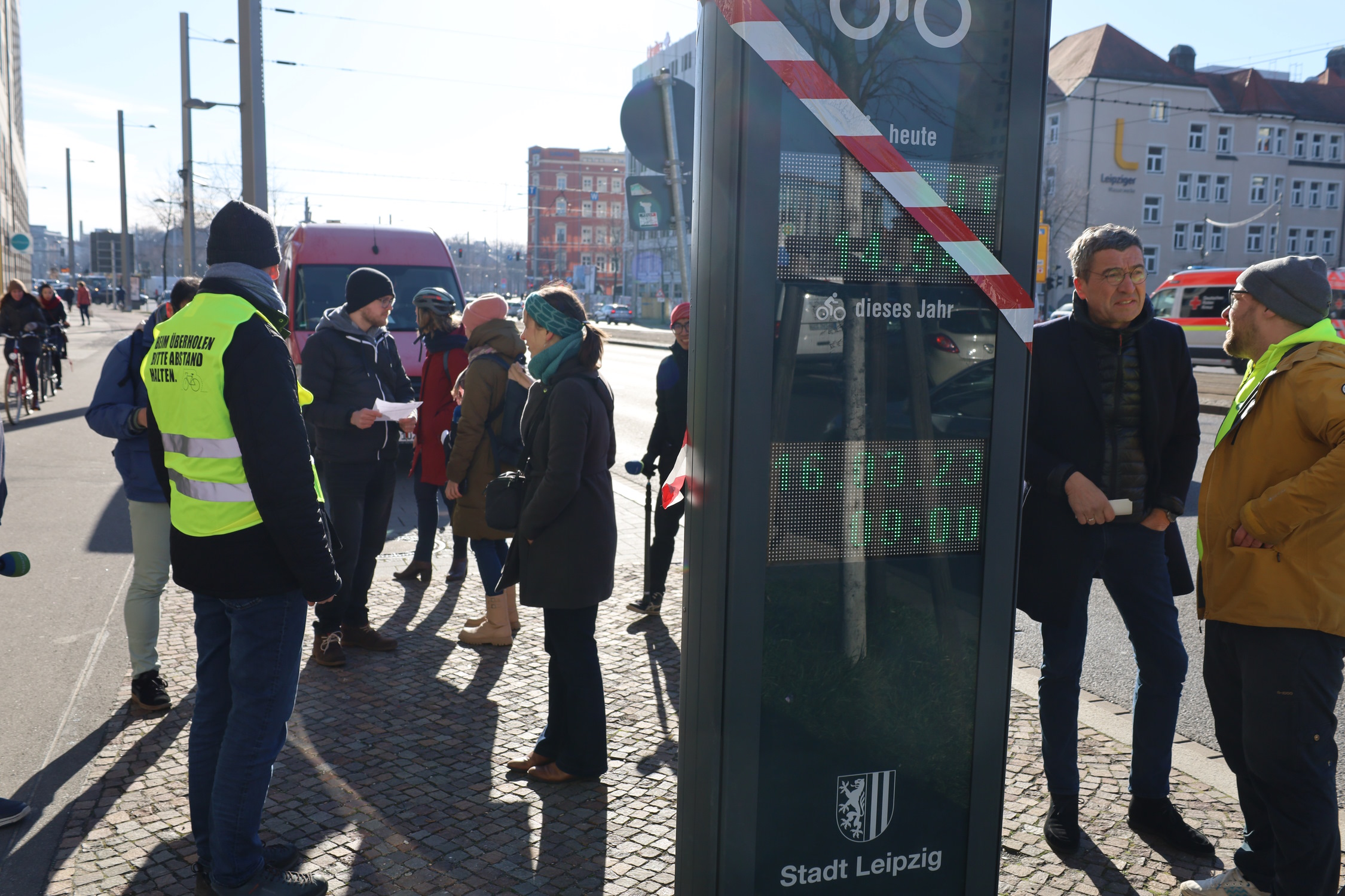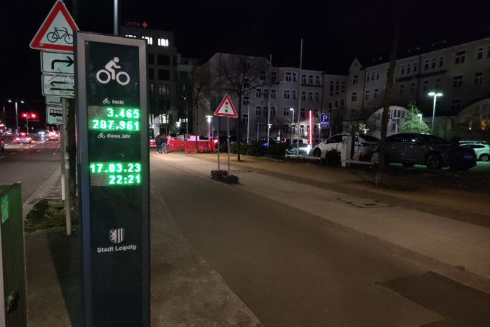 Die Stelle ist absichtlich gewählt – citynah, gut einsehbar und an der am stärksten befahrenen Radroute aus dem Leipziger Westen, direkt am Grimmaischen Steinweg. Monatelang war die Säule mit einer Plane umwickelt. Man sah nicht, dass sie zählte. Am Donnerstag, dem 16. März, wurde sie von Baubürgermeister Thomas Dienberg und Dr. Christoph Waack, Radverkehrsbeauftragter Stadt Leipzig, offiziell in Dienst gestellt: die Säule mit dem Display, das direkt anzeigt, wie viele Radfahrer/-innen hier vorbeikommen.