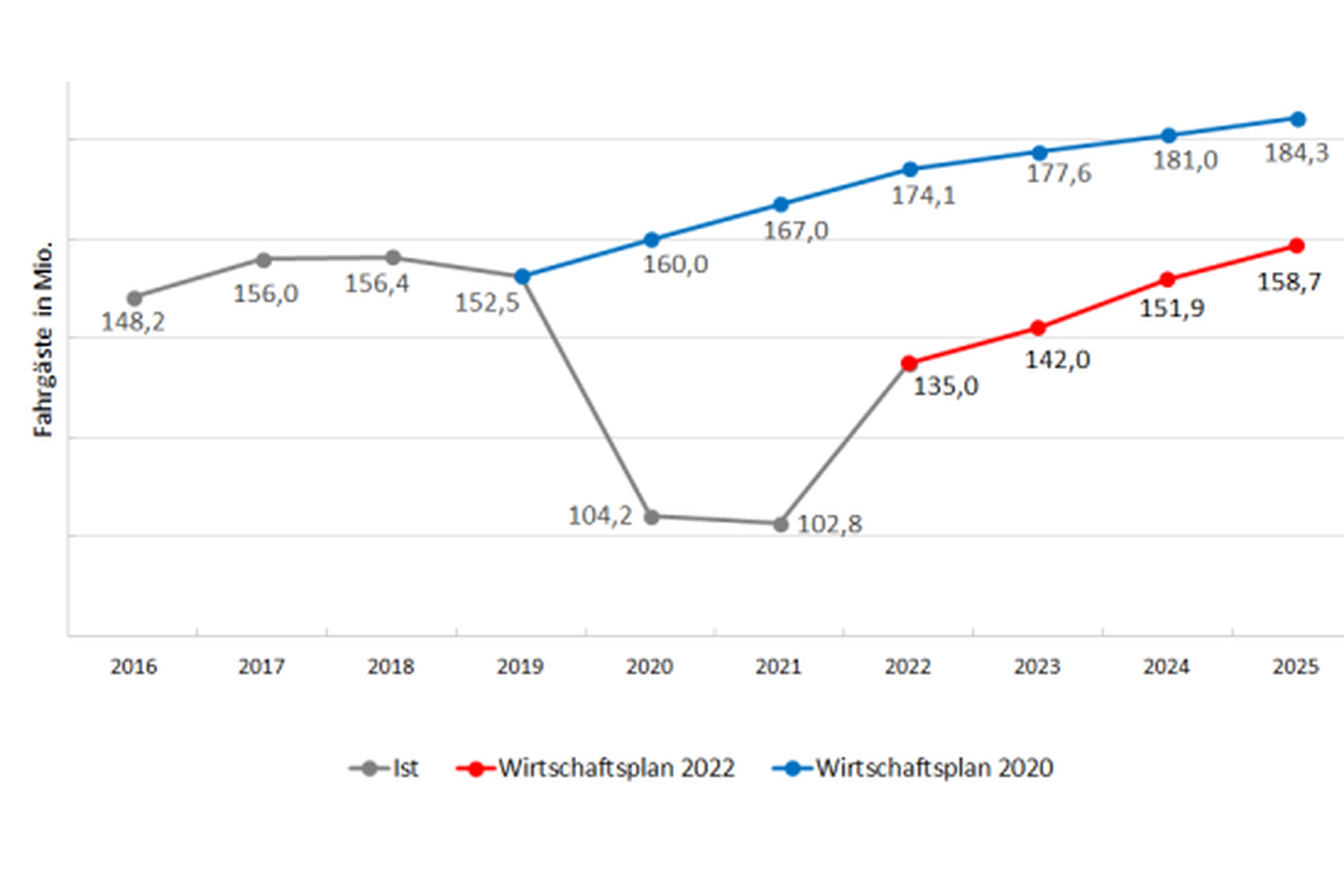 „Die im Nachhaltigkeits-Szenario für das Jahr 2030 angenommenen 220 Mio. Fahrgäste sind aufgrund der Bevölkerungsentwicklung und des Fahrgastrückgangs in Verbindung mit der Coronapandemie nicht mehr erreichbar. Aktuell scheinen 180 Mio. Fahrgäste in 2030 realistisch“, heißt es jetzt in der Vorlage des Dezernats Stadtentwicklung und Bau, mit der die drohenden Finanzierungslücken für 2023 und 2024 und damit die zusätzlichen Zuschüsse für die Stadt beziffert werden.