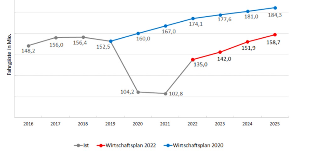 Woher diese Vermutung stammt, steht nicht da. 2022 war das erste Jahr, in dem sich die Fahrgastzahlen wieder stabilisierten. Nach knapp 100 Millionen in den Jahren 2020 und 2021 waren es inzwischen erstmals wieder 135 Millionen. Aber das hat nicht nur mit der „Rückkehr“ von Fahrgästen zu tun, die in der Corona-Zeit lieber den ÖPNV mieden, sondern damit, dass das Fest-, Gastro- und Messegeschäft auch 2022 erst langsam wieder anlief.