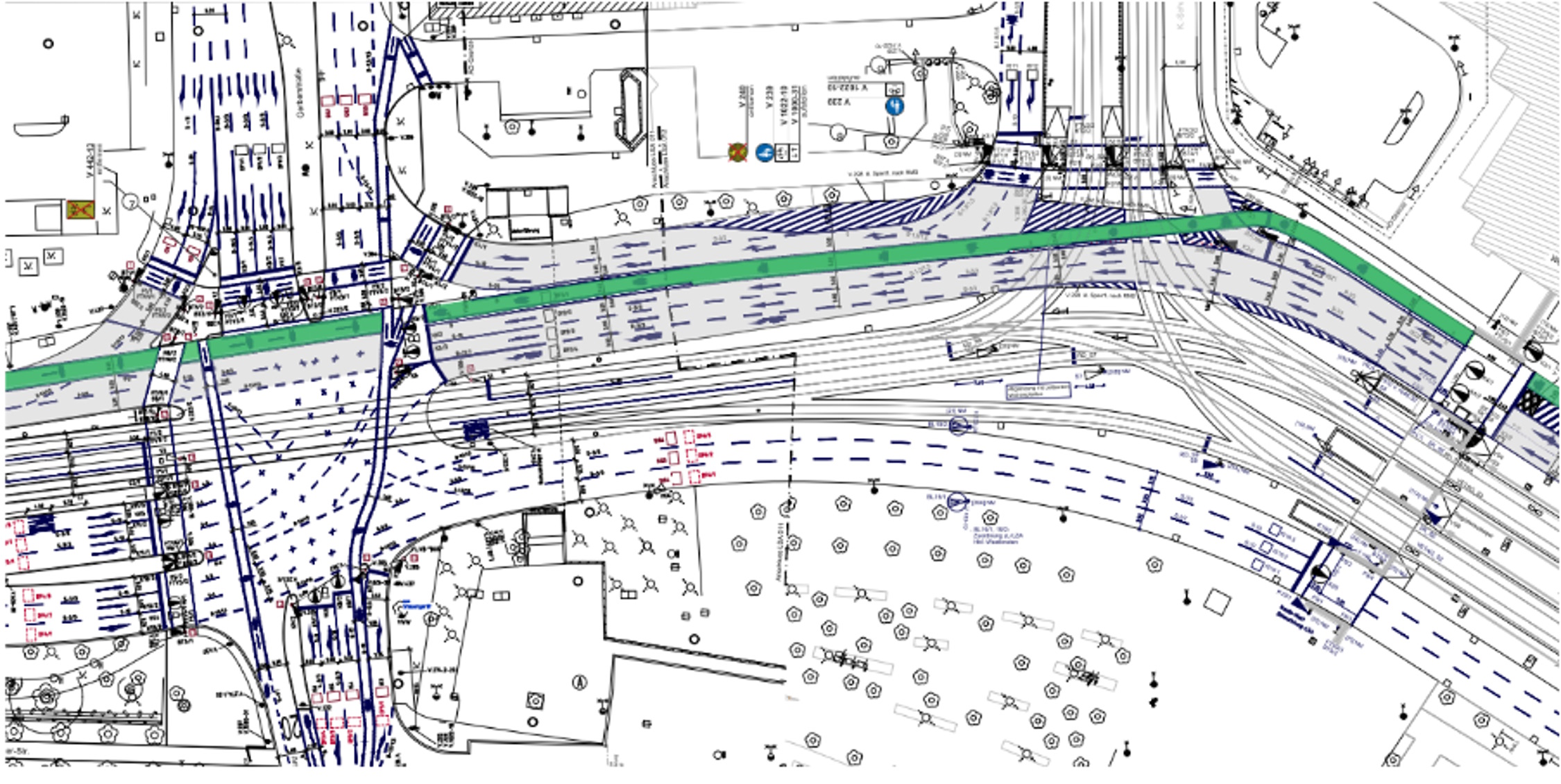 Um die Verkehrssicherheit an diesem neuralgischen Punkt vorm Hauptbahnhof zu erhöhen, wurde der Radverkehr von Richtung Ost nach West auf eine Fahrspur gelegt. Fußgänger erhielten ebenfalls mehr