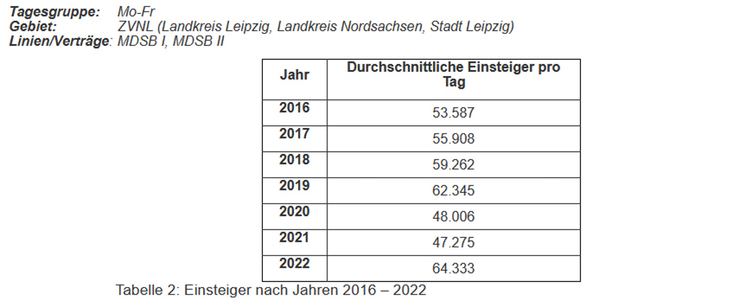 Also gibt es nur die Einsteigerzahlen pro Tag für das ZVNL-Gebiet (Leipzig, Landkreis Leipzig, Nordsachen), und das auch nur für die Wochentage. Aber die Zahlen zeigen auch so schon deutlich, wie der Zuspruch für das S-Bahn-Angebot von 53.587 täglichen Einsteigern im Jahr 2016 auf 62.345 Einsteiger im Jahr 2019 stetig anwuchs. Dann kamen die beiden Corona-Jahre 2020 und 2021, als die Zahlen deutlich zurückgingen. Aber schon 2022 wurde mit 64.333 Einsteigern die Zahl von 2019 deutlich übertroffen.