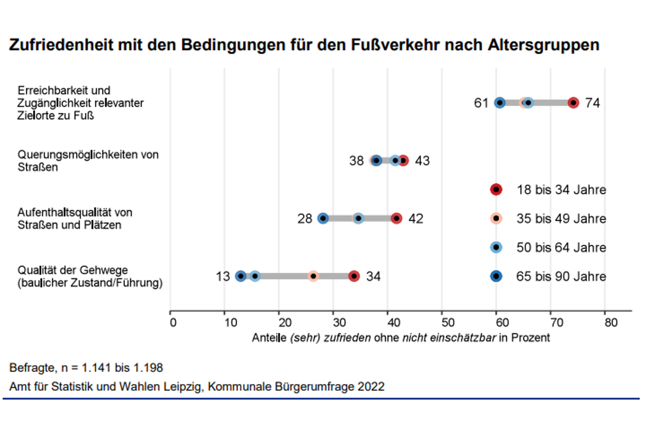 „In den Altersgruppen der 50- bis 64-Jährigen sowie der Personen ab 65 Jahren liegt der Anteil der Zufriedenen bei 15 bzw. 13 Prozent. Im Gegensatz dazu zeigt sich ein Drittel der Befragten unter 35 Jahren zufrieden mit der Qualität der Fußwege. In ähnlichem Maße zeigen sich auch bei der Bewertung der Aufenthaltsqualität der Straßen und Plätze unterschiedliche Wahrnehmungen in den Altersgruppen, die auf unterschiedliche Erwartungen und Bedürfnisse in Bezug auf die Gestaltung öffentlicher Räume hindeuten.“
