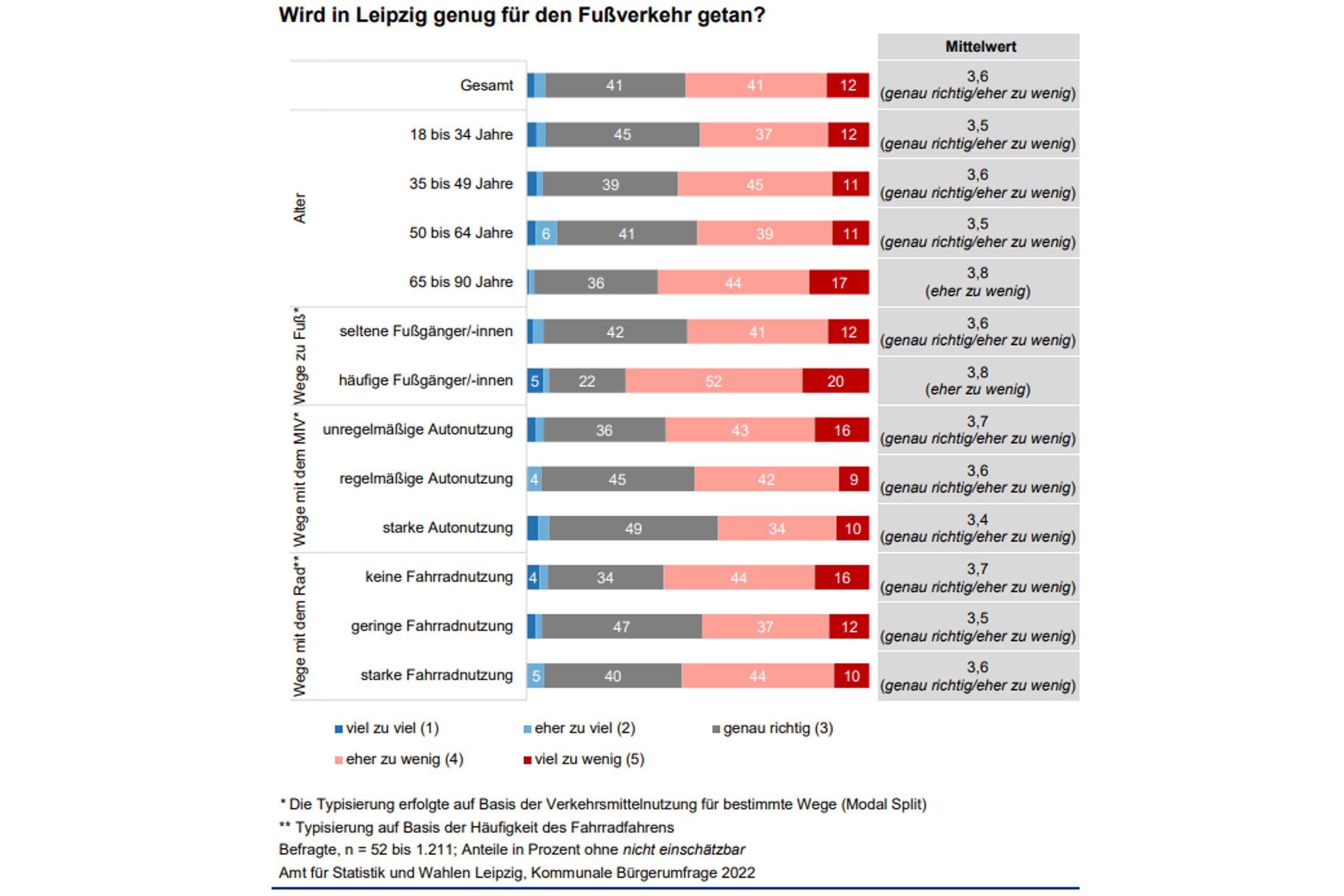 Trotzdem: „Mit 54 Prozent ist eine Mehrheit der Befragten (ohne nicht einschätzbar) der Meinung, dass für den Fußverkehr eher oder viel zu wenig getan wird (Radverkehr: 41 Prozent). Gleichzeitig denken jedoch nur 5 Prozent der Leipzigerinnen und Leipziger, dass eher oder viel zu viel für den Fußverkehr getan wird (Radverkehr: 34 Prozent).