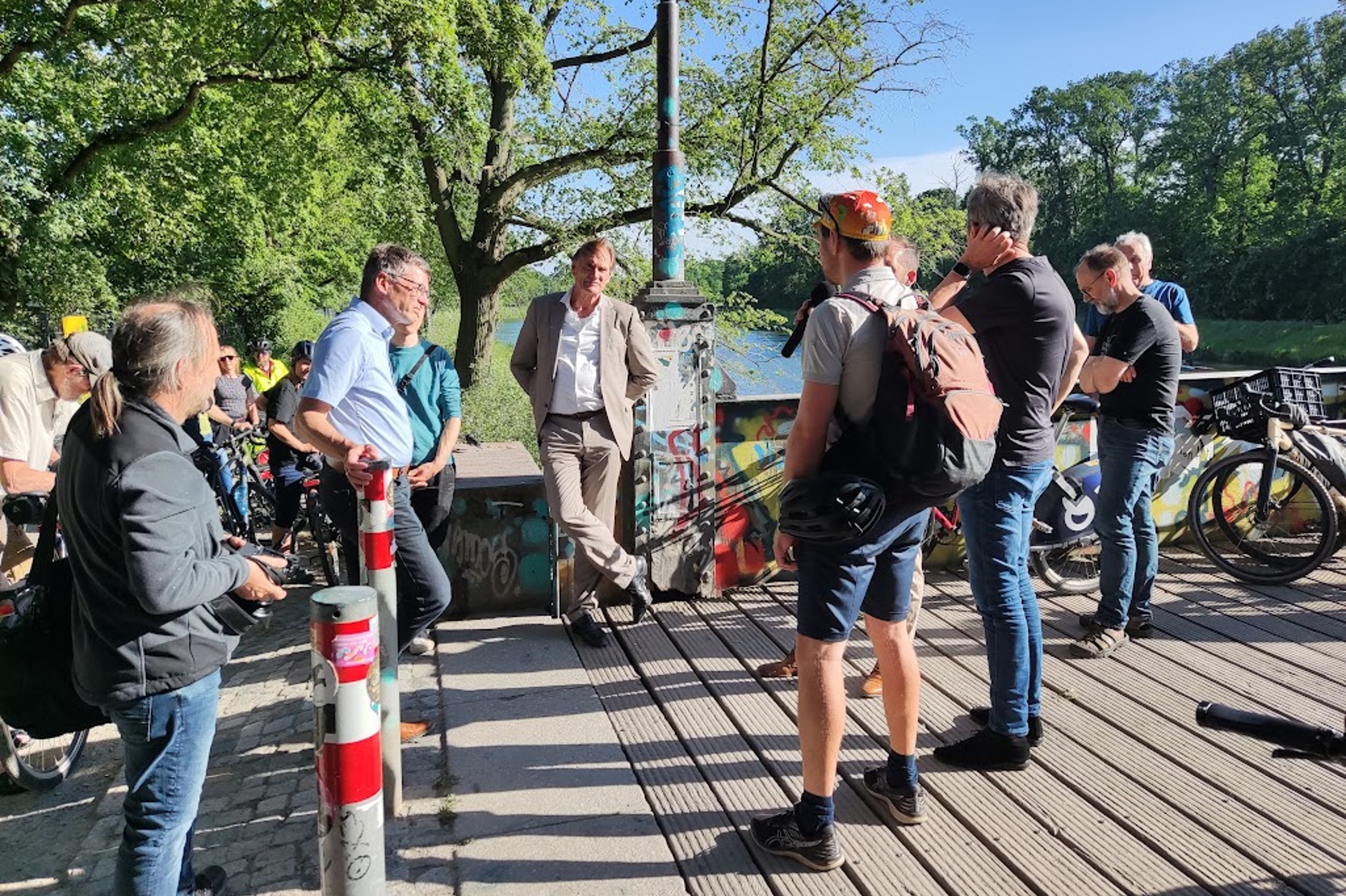 Eine Tour, die eigentlich voller Baustellen ist, an denen das Verkehrs- und Tiefbauamt (VTA) seit Jahren arbeitet. Deswegen waren auch Verkehrsbürgermeister Thomas Dienberg und VTA-Amtsleiter Michael Jana mit, außerdem Frederik Sander, der derzeit amtierende Radverkehrsbeauftragte der Stadt, der quasi die Verbindungsstelle der Leipziger Radfahrer zur Verwaltung ist.