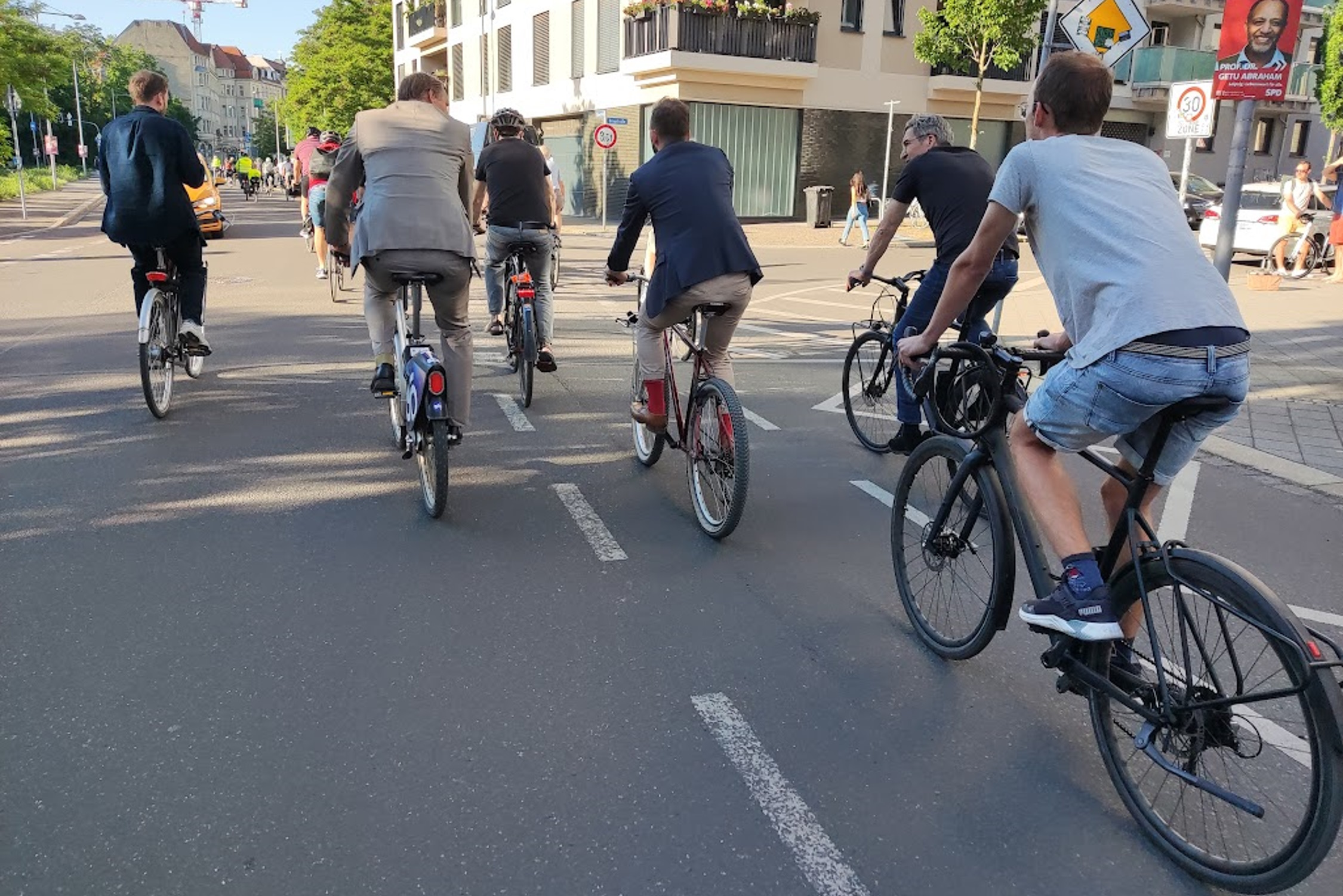 Die sieben Kilometer lange Rundtour führte dann über die Richard-Lehmann-Straße und die August-Bebel-Straße zum Bundesverwaltungsgericht. Und in der August-Bebel-Straße war dann endgültig zu sehen, welche Probleme die dicht an dicht geparkten Autos den Radfahrer/-innen schaffen. Nicht nur wird es auf der Fahrbahn eng – auch das Einbiegen in die Straße ist problematisch, weil die geparkten Autos die Sicht versperren. Gerade wenn man als Radfahrer dann von der Karl-Liebknecht-Straße kommt und in die August-Bebel-Straße einbiegt.
