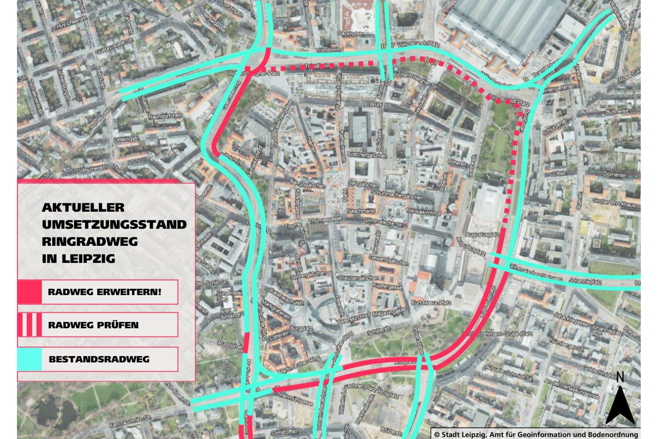 Für den Ökolöwen gibt es drei Schlüsselprojekte, die jetzt angegangen werden müssen: Erstens müsse die Radweglücke auf dem südöstlichen Ring zwischen Leuschnerplatz und Augustusplatz geschlossen werden. Zweitens müsse die Stadt den Übergang vom bestehenden Ringradweg auf dem Goerdelerring in die Pfaffendorfer Straße herstellen. Drittens müsse die Kreuzung am Neuen Rathaus angepasst werden, damit Rad- und Autoverkehr besser in Richtung Harkortstraße abfließen können.