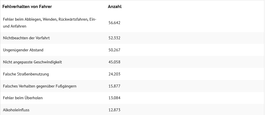Sieht man sich aber die Nummern drei und vier an, dann gibt es da zumindest eine Korrelation. Gerade auf der Überholspur der Autobahn ist oft der ungenügende Abstand eine Folge der überhöhten Geschwindigkeit des hinteren Fahrzeuges. Auf nicht begrenzten Strecken kann die Geschwindigkeitsdifferenz schon mal über 50 km/h betragen. Das führt regelmäßig zu gefährlichen Situationen und auch zu Unfällen.