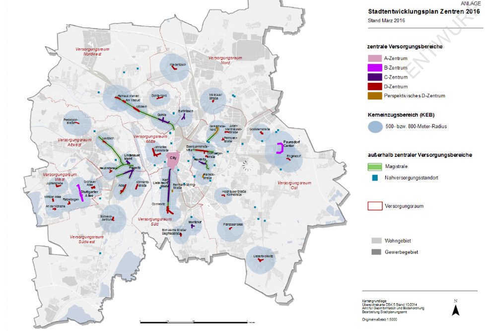 „Das zukünftige Netz dieser urbanen zentralen Versorgungsbereiche soll 42 Zentren umfassen. Bisher waren es 65. Die geplante Reduktion ermöglicht eine flexiblere Steuerung außerhalb der Zentren in sich stark verändernden Stadtgebieten“, teilte das Planungsdezernat dazu mit. „Es gibt auch Entwicklungsperspektiven für neue Zentrale Versorgungsbereiche: Die Bereiche Gorkistraße-Nord, Riebeckstraße und Bernhard-Göring-Straße sollen als perspektivische D-Zentren gestärkt werden: Sie befinden sich in Stadtteilen, in denen sich die Nachfrage besonders stark entwickelt hat.“