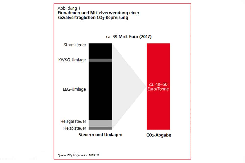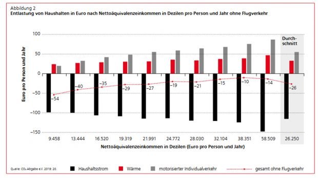 „Die Einnahmen sollten zur Gegenfinanzierung bestehender Steuern und Abgaben eingesetzt werden. So können die EEG-Umlage, die KWKG-Umlage, die Stromsteuer sowie die Steuern auf Heizöl und -gas entfallen“, schlägt er vor. „Die Förderung des EEG und des KWKG wären davon unberührt. Anders als eine pauschale Rückerstattung führt die Gegenfinanzierung dazu, dass Strom für Haushalte deutlich günstiger wird, die Kosten für fossil betriebene Heizungen und Kraftstoffe hingegen steigen. Bei einem Anfangspreis von 40 Euro je Tonne CO2 stehen für Haushalte der Preisreduktion für Strom um 9 Cent pro Kilowattstunde (ct/kWh) zusätzliche Kosten bei Wärme von 0,5 bis 0,6 ct/kWh und bei Treibstoffen von 1,4 bis 1,5 ct/kWh (jeweils inkl. Umsatzsteuer) gegenüber. Die Preise für Flugtreibstoffe würden steigen.“