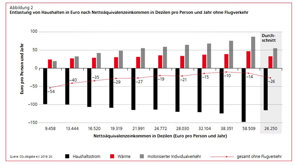 Denn gerade ärmere Haushalte leben in der Regel energiesparender – ihre Wohnungen sind deutlich kleiner, ihre Autos (wenn sie welche haben) sind deutlich kleiner, die gefahrenen Strecken kürzer, Ölheizungen haben sie als Mieter sowieso nicht. Und Flugreisen sind bei ihnen die Ausnahme.