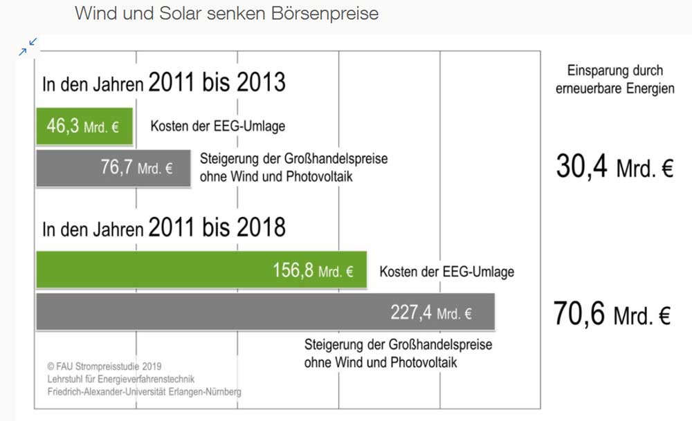 Forscher der Friedrich-Alexander-Universität Erlangen-Nürnberg (FAU) rekonstruierten auf Grundlage historischer Preisdaten des „Day-Ahead“-Marktes, welche Preise sich an der Strombörse in den Jahren 2011 bis 2018 ohne die Einspeisung aus Windkraft und Photovoltaik eingestellt hätten. Das FAU-Diskussionspapier belegt, dass die Mehrkosten aufgrund höherer Großhandelspreise die Kosten der EEG-Umlage 2011 bis 2018 insgesamt deutlich überschritten hätten: um 45 Prozent.