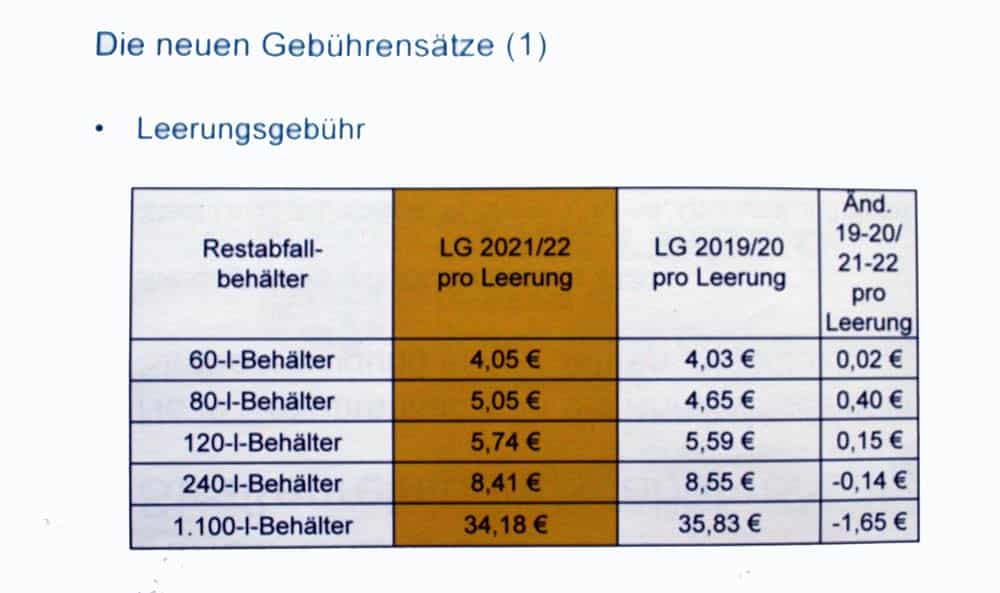 Die Kosten für die Abfallwirtschaft steigen für die Jahre 2021/2022 voraussichtlich um 2,66 Millionen Euro gegenüber den Vorjahren 2019/2020. Da der Betriebsaufwand für beide Jahre bei rund 93 Millionen Euro liegt, entspricht das einer Steigerung von rund 3 Prozent.