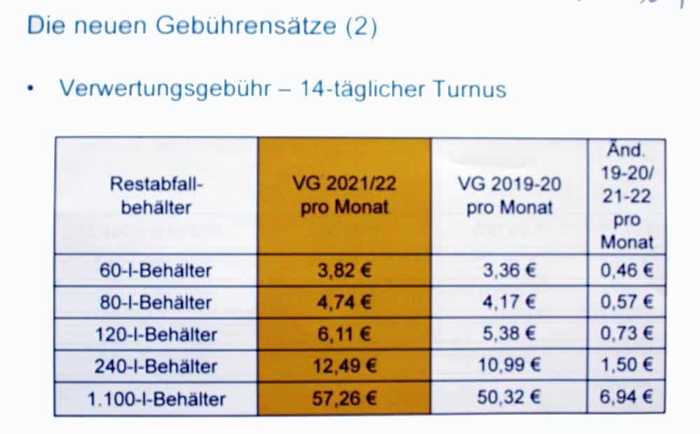 Die monatliche Verwertungsgebühr bei regulärer 14-täglicher Entsorgung steigt für die einzelnen Behälterarten um 0,46 Euro bis 6,49 Euro. Sie ist bei wöchentlicher Leerung doppelt so hoch. Die Biotonnenfestgebühr sinkt zwischen 0,12 Euro und 0,47 Euro pro Monat, wenn sie regulär alle 14 Tage zur Leerung bereitgestellt wird. Erfolgt eine Umstellung auf wöchentliche Entsorgung, verdoppelt sich die monatliche Festgebühr.