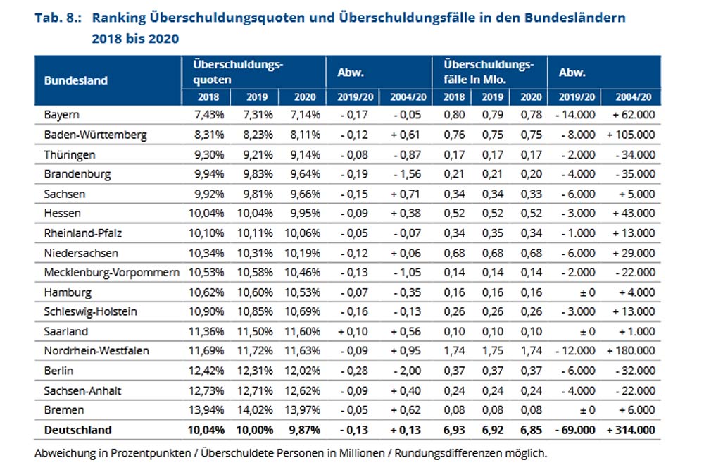 Bayern (7,14 Prozent; – 0,17 Punkte) und Baden-Württemberg (8,11 Prozent; – 0,12 Punkte) verbleiben mit Abstand vor Thüringen (9,14 Prozent; – 0,08 Punkte) – alle drei Bundesländer mit einer erneut verbesserten Überschuldungsquote. Brandenburg (9,64 Prozent; – 0,19 Punkte) verbessert sich um einen Platz auf Rang vier. Auf Rang fünf folgt dann Sachsen mit einer Quote von 9,66 Prozent (nach 9,81 im Vorjahr).