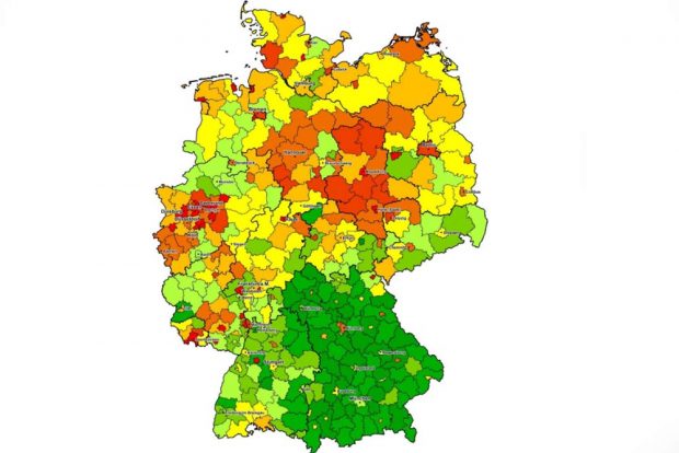 Die Schlusslichter bleiben wie in den Vorjahren Bremen (13,97 Prozent; – 0,05 Punkte), Sachsen-Anhalt (12,62 Prozent; – 0,09 Punkte) und Berlin (12,02 Prozent; – 0,28 Punkte) – alle drei ebenfalls mit einer verbesserten Überschuldungsquote, so Creditreform.