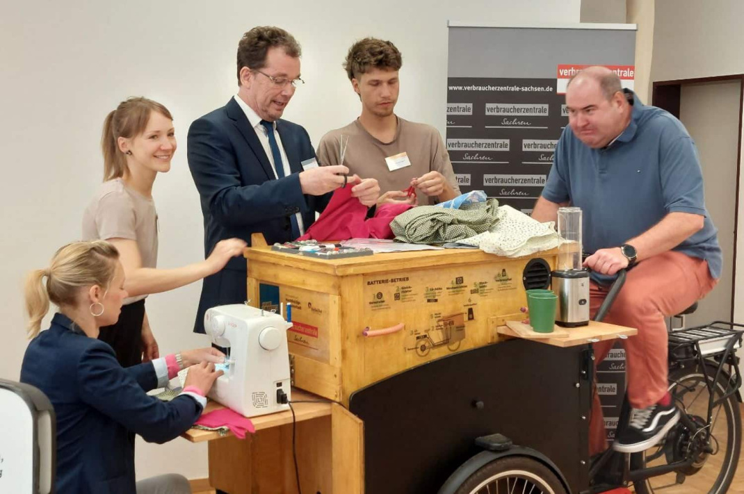Spielerisch können Interessierte, die sich trauen auf dem Klimafahrrad der Verbraucherzentrale Sachsen in die Pedale zu treten, auf einfache Weise erleben, wie die Nähmaschine einer anderen Person mit dem notwendigen Strom versorgt wird. Eine an dem Lastenrad fest installierte Nähmaschine wird mit der erzeugten Energie angetrieben, sodass zeitgleich aus Stoffresten etwas Praktisches genäht werden kann.