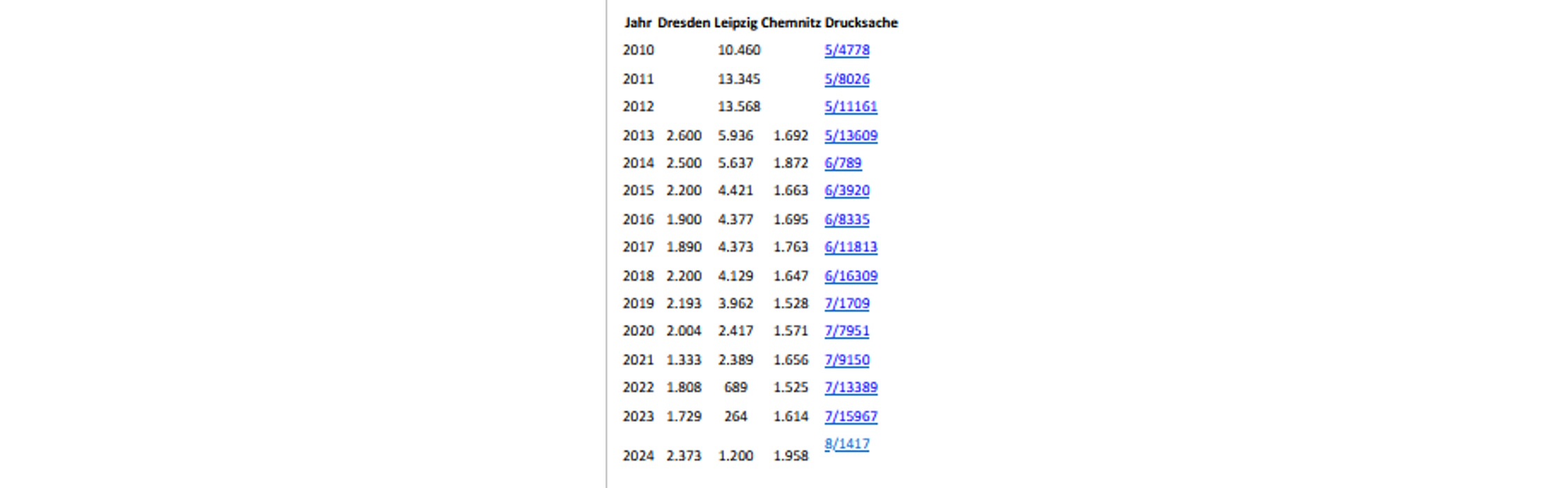 Dabei fällt auf, dass die Zahl der Stromsperren in Dresden und Chemnitz mit 2.373 bzw. 1.958 deutlich höher lag als in Leipzig mit 1.200. Gleichzeitig sticht ins Auge, dass auch in Leipzig die Zahl von 264 auf 1.200 wieder deutlich in die Höhe geschnellt ist, also wieder mehr Haushalte Schwierigkeiten haben, ihre Stromrechnung zu bezahlen, auch wenn der Wert noch lange nicht wieder auf der Höhe von 2021 liegt, als es 2.389 Abschaltungen gab. Und er liegt auch noch deutlich unter dem Wert von 2013, damals verzeichnete allein Leipzig 5.963 Abschaltungen.