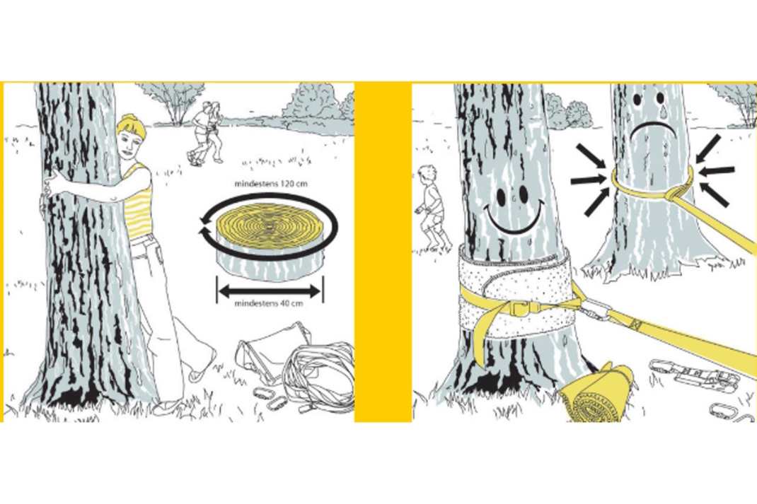 Befestigung nur an Bäumen, die ein Erwachsener gerade noch umfassen kann. Das entspricht etwa einem Stammumfang von 120 cm.