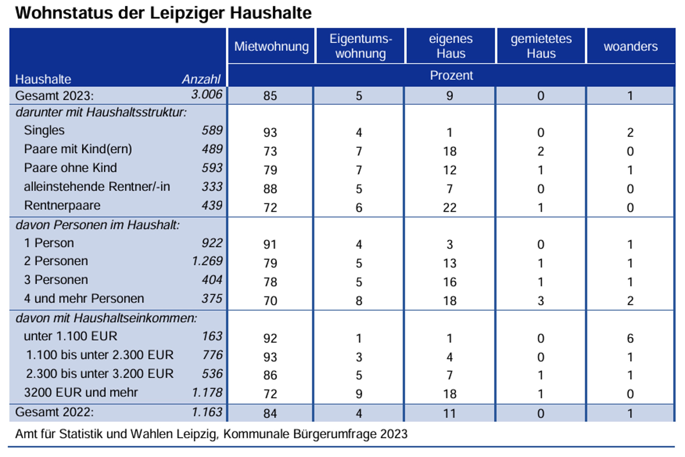 Nur 4 Prozent der Leipziger leben in einer Eigentumswohnung, die meisten davon in jenen Wohnungen, die ihnen in den frühen 1990er Jahren zu noch bezahlbaren Konditionen angeboten worden waren. Die meisten Leipziger – 87 Prozent (2024) – leben zur Miete, eine Zahl, die sogar leicht angestiegen ist in den letzten Jahren. Trotz des florierenden Marktes mit Eigentumswohnungen.
