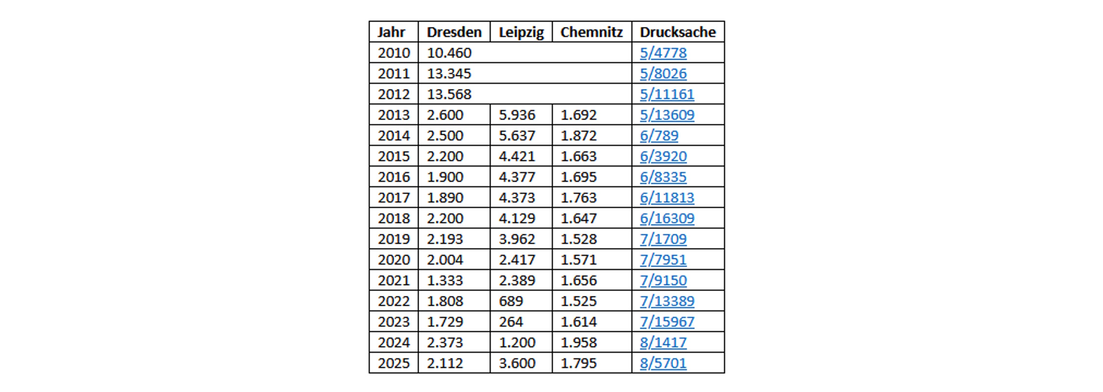 „In der Messestadt dauerten 70 Prozent der Sperrungen über 15 Tage an. 2024 war es ein Tag weniger gewesen. Wie im Vorjahr dauerten in Dresden die Sperrungen eine Woche. Für Chemnitz wurden auch für 2025 diese Daten nicht erfasst. So hoffnungsvoll die Zahlen für Chemnitz und Dresden erscheinen mögen: Jeder Fall ist einer zu viel. Die Gründe für den enormen Anstieg in Leipzig müssen aufgeklärt werden.“