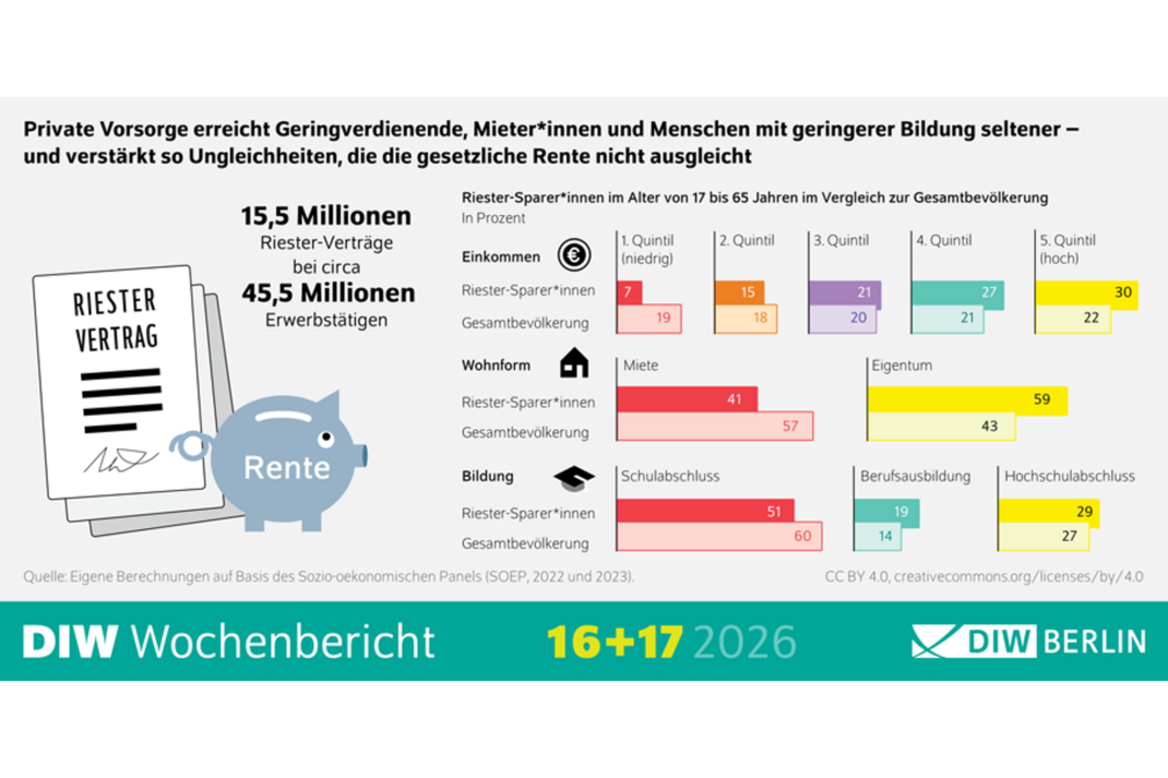 „Wir wissen aus der Forschung, dass freiwillige Systeme zur zusätzlichen Altersvorsorge nicht die erforderliche Verbreitung erreichen, weil vor allem diejenigen vorsorgen, die ohnehin über ausreichende Ressourcen verfügen“, sagt DIW-Rentenexperte Johannes Geyer. Auch die neue Ausgestaltung der Förderung sei kritisch zu sehen, da sie tendenziell Haushalte mit höheren Einkommen begünstige. „Die Förderung hängt stark davon ab, wie viel eingezahlt wird – dadurch profitieren Menschen mit höherem Einkommen überproportional“, so Geyer.