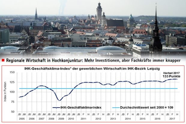 Was für ganz Sachsen gilt, gilt auch für den IHK-Bezirk Leipzig. Die Wirtschaft brummt, die Auftragsbücher sind voll. Und seit dem Frühjahr ist die Stimmung auf einem Allzeithoch. Eine aktuelle Geschäftslage auf Topniveau und nur geringfügig schwächere Prognosen lassen den IHK-Geschäftsklima-Index erneut auf seinem erst im Frühjahr erreichten Allzeithoch von 133 Punkten einpegeln, meldet die IHK zu Leipzig.
