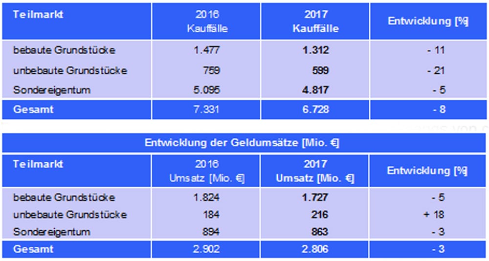 Und das elementarste Stück des Immobilienmarktes erlebte 2017 geradezu eine Vollbremsung: „Im Teilmarkt der unbebauten Grundstücke gab es deutliche Marktbewegungen. Bei Geschossbaugrundstücken gingen die Transaktionen um fast 30 Prozent zurück, bei den Baugrundstücken für den individuellen Wohnungsbau verringerten sie sich sogar um etwa 47 Prozent.“