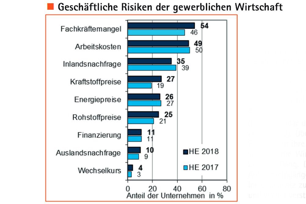 Der Fachkräftemangel ist für die Unternehmen nach wie vor der größte Risikofaktor. Über die Hälfte der Firmen (54 Prozent) sieht dadurch die eigene Geschäftstätigkeit beeinträchtigt. Mittlerweile 45 Prozent der Unternehmen können offene Stellen innerhalb von zwei Monaten nicht mehr besetzen, zum Vorjahreszeitpunkt sagten das noch 40 Prozent. Auch die Höhe der Arbeitskosten belastet weiterhin viele Betriebe, sie belegen im Risikoranking unverändert den zweiten Rang. Dagegen wird die Inlandsnachfrage aufgrund aktuell hoher Auftragseingänge weniger häufig als Risiko gesehen als noch vor einem Jahr. Stattdessen werden die Kraftstoffpreise, die binnen eines Jahres deutlich anstiegen, wieder verstärkt als Risikofaktor wahrgenommen.