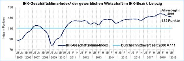So aufs Knappe zusammengefasst lauten sie: „Die Unternehmen im IHK-Bezirk Leipzig sind trotz steigender Kosten und einer Vielzahl an geschäftlichen Risiken mit ihrer Geschäftslage nach wie vor sehr zufrieden. Die Geschäftsaussichten gehen jedoch weiter zurück. Demzufolge sinkt der IHK-Geschäftsklima-Index im Vergleich zur Herbstumfrage 2018 um weitere zwei auf nunmehr 132 Punkte. Zu diesen Ergebnissen kommt die Konjunkturbefragung der Industrie- und Handelskammer (IHK) zu Leipzig zum Jahresbeginn 2019, an der sich 600 Unternehmen aller Branchen und Größenklassen mit insgesamt mehr als 39.000 Beschäftigten beteiligt haben.“