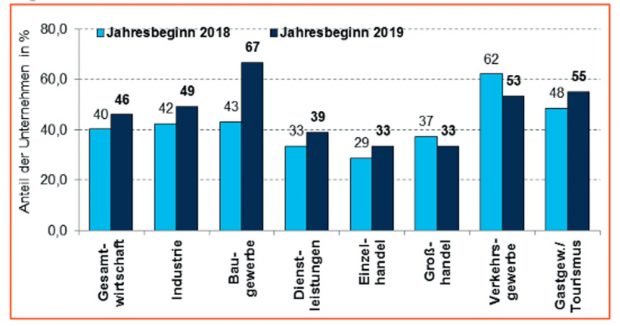 Tatsächlich gilt für die aktuelle Lageeinschätzung: „Trotz eines insgesamt schwächeren Konjunkturverlaufs im vergangenen Jahr beurteilen die Betriebe ihre aktuelle Geschäftslage weiterhin ausgesprochen positiv. Insbesondere im vierten Quartal liefen die Geschäfte branchenübergreifend gut. Die Lagebewertung steigt insgesamt sogar per Saldo um einen auf +56 Prozentpunkte, was wieder der Bestmarke vom Jahresbeginn 2018 entspricht.“
