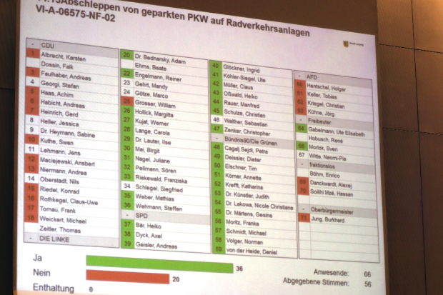 Dies wären weniger als ein Prozent aller Fälle, in denen Pkw-Nutzer einen Radweg blockierten, wo „die Mitarbeiter des Ordnungsamtes zu dem Ergebnis gekommen sind, dass hier eine Gefährdung der Radfahrer stattfinden könnte. Sie werden also ihrer Aufgabe nicht gerecht“, so Volger. Eine Ouvertüre zu einem Watschenkonzert, welche in einem Beschluss münden sollte, der die Lahmen im Leipziger Ordnungsamt zum Gehen und so manchen Falschparker öfter sein Auto in der Sammelstelle abholen lassen dürfte.