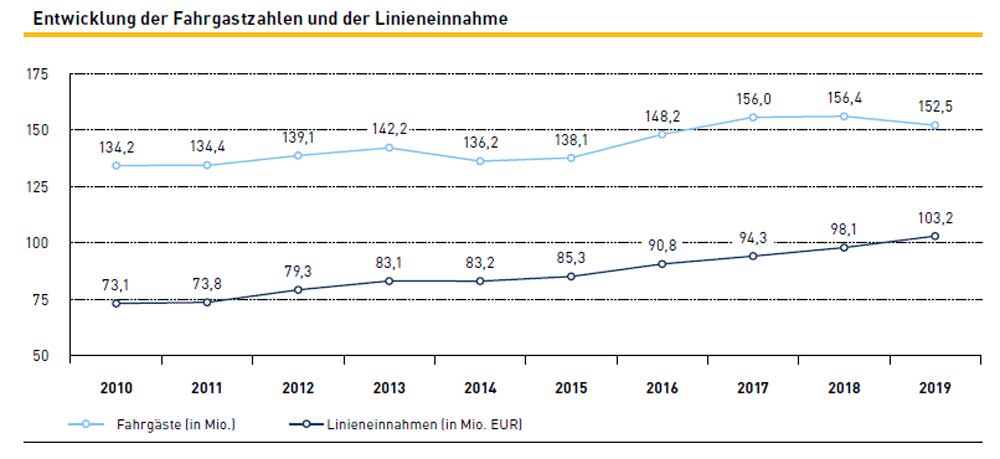 Denn geplant hatte man das Jahr mit 106,7 Millionen Euro an Fahrgasteinnahmen. Geworden sind es am Ende aber „nur“ 103 Millionen. „Nur“ deshalb, weil auch das eine deutliche Steigerung gegenüber dem Vorjahr ist. 2018 hatte man mit 100 Millionen Euro geplant und am Ende 98 Millionen Euro eingenommen.