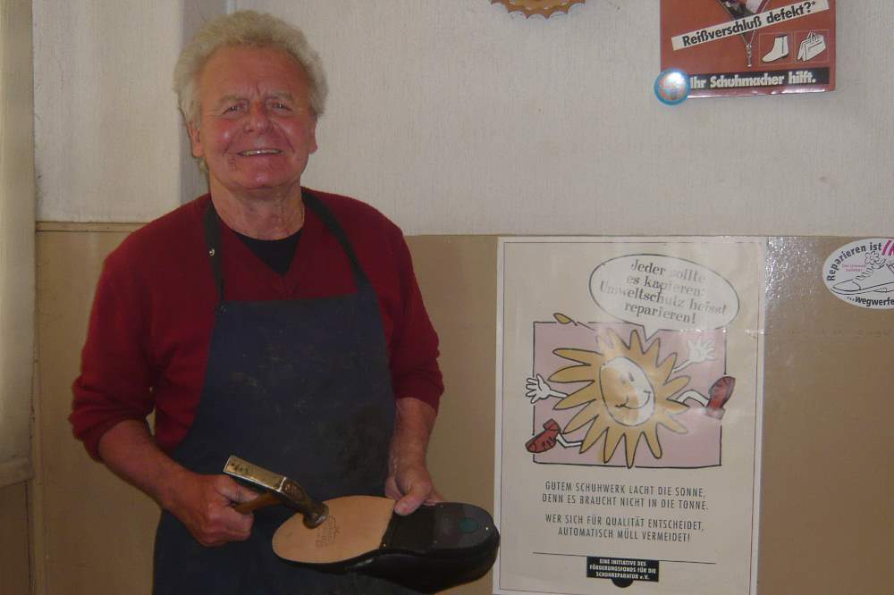 Der Geruch von Leder und Kleber steigt mir in die Nase, als ich den Schusterladen von Peter Baumann betrete. Die Einrichtung ist rustikal und unaufgeregt. An der vergilbten Wand fällt mir ein Plakat mit einem passenden Motto ins Auge: „Jeder sollte es kapieren, Umweltschutz heißt Reparieren. Gutem Schuhwerk lacht die Sonne, denn es braucht nicht in die Tonne. Wer sich für Qualität entscheidet, automatisch Müll vermeidet.“„Zu DDR-Zeiten sind sehr viele zum Schuhmacher gegangen“, erzählt Peter Baumann, „fast alle“. An manchen Tagen hätten sich vor der PGH Schuhmacher Warteschlangen gebildet, besonders am sogenannten Schnelldienst-Tag, wenn die Reparaturen bis zum nächsten Nachmittag erledigt sein mussten. „Da hatten wir bis abends um 22 Uhr in der Werkstatt zu tun.“ PGH? „Das heißt Produktionsgenossenschaft Handwerk. Es gab ja fast keine selbstständigen Schuhmacher“, erklärt Baumann freundlich.