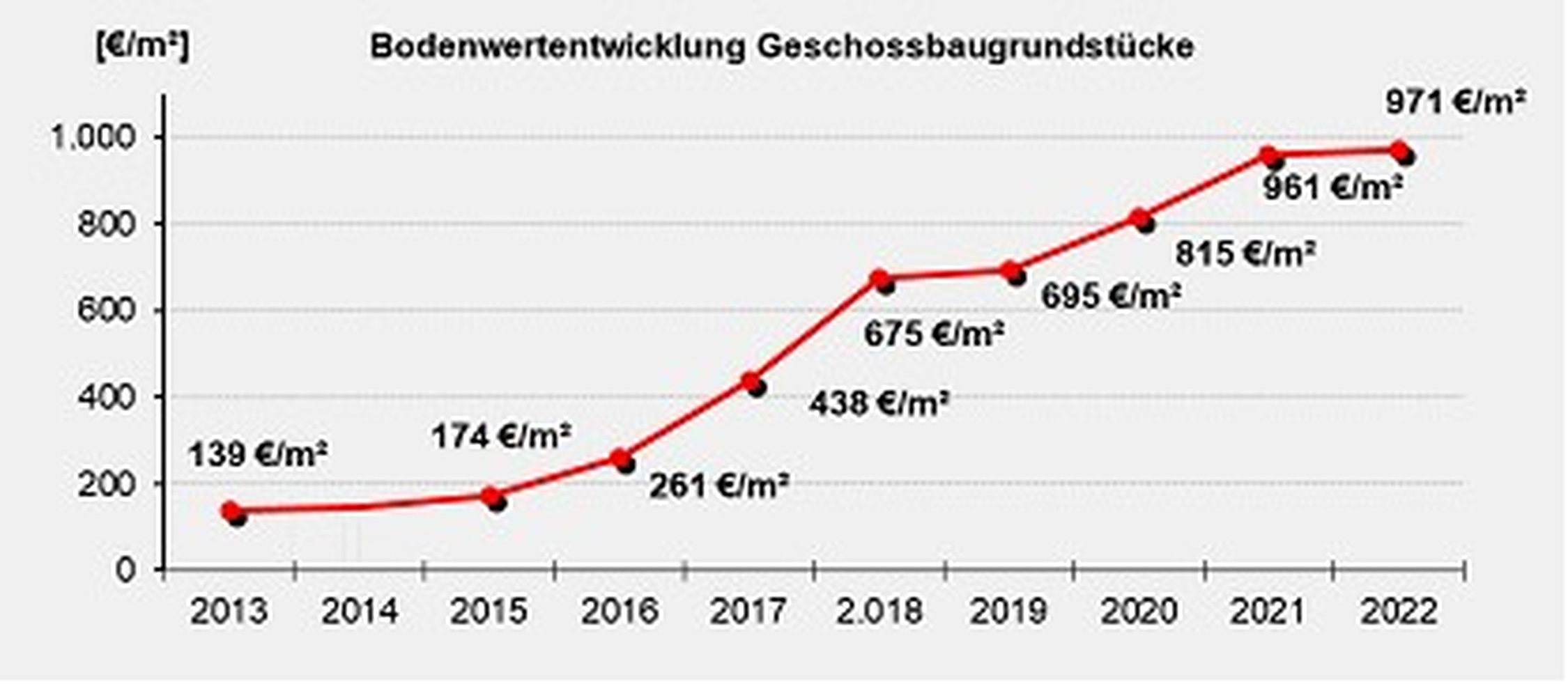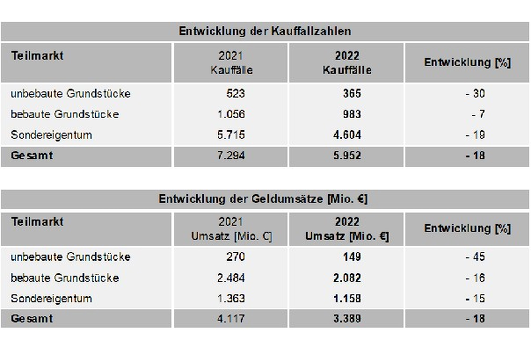 lagen 2022 mit nur 22 Transaktionen mehr als ein Drittel unter dem Vorjahresniveau. Der Geldumsatz brach noch deutlicher ein und erreichte mit knapp 20 Millionen Euro nur noch gut ein Drittel des Vorjahres. Der durchschnittliche Bodenrichtwert für unbebaute Wirtschaftsgrundstücke lag 2022 bei 99 Euro je Quadratmeter und damit rund 5 Prozent über dem Wert von 2021. Die Kauffallzahlen bei den bebauten Wirtschaftsgrundstücken lagen mit 159 Transaktionen etwa 1 Prozent unter dem Vorjahresniveau. Das Umsatzvolumen hingegen ging um rund 5 Prozent auf rund 950 Millionen Euro zurück.