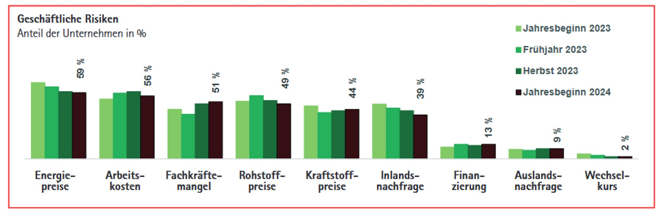 Doch gleich dahinter folgen die Arbeitskosten und Rohstoffpreise auf dem zweiten und dritten Platz. Mit 56 und 51 Prozent bewertet immer noch mehr als die Hälfte der gewerblichen Wirtschaft diese Faktoren als ein Risiko für ihre zukünftige Geschäftstätigkeit.